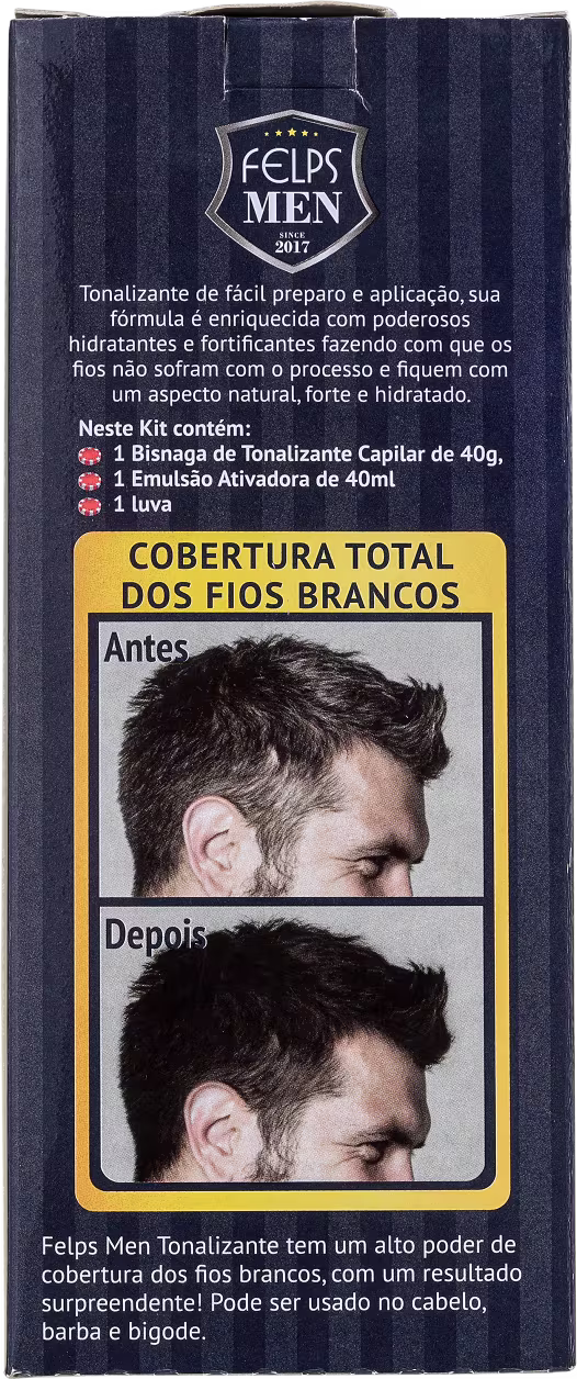 Tonalizante para cabelo e barba. Tonalizante Capilar Felps Men Craps cobre os fios brancos uniformemente e com aspecto natural. Contém todo o kit necessário para uma aplicação completa.