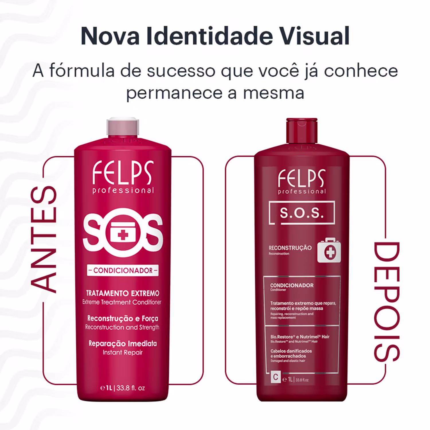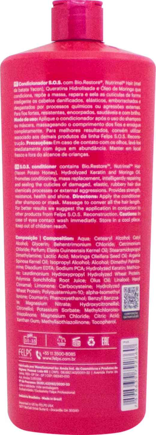 O Condicionador Felps Professional S.O.S. Reconstrução nutre da raiz até as pontas, para que os cabelos possam crescer muito mais saudáveis. Com fórmula especial, enriquecida com Óleos de Moringa e de Argan, Keratina Enzimática e Mel de Batata, o produto também proporciona maciez e luminosidade, além ser ideal para revigorar os fios que passaram por processos químicos agressivos.