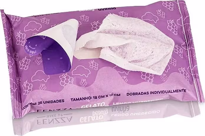 Lenço umedecido. Fenzza Gelato Beauty Uvinha deixa um cheirinho agradável enquanto limpa a pele delicadamente sem agredir.