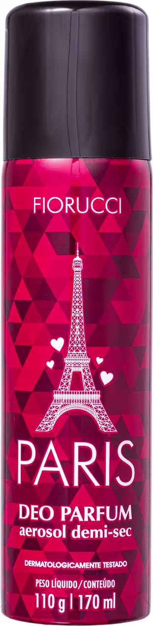 Desodorante feminino em aerossol. Fiorucci Paris Desodorante combina proteção com romantismo ao trazer um aroma encantador, inspirado no amor típico da cidade de Paris. Consegue neutralizar o odor corporal sem provocar irritações na pele.