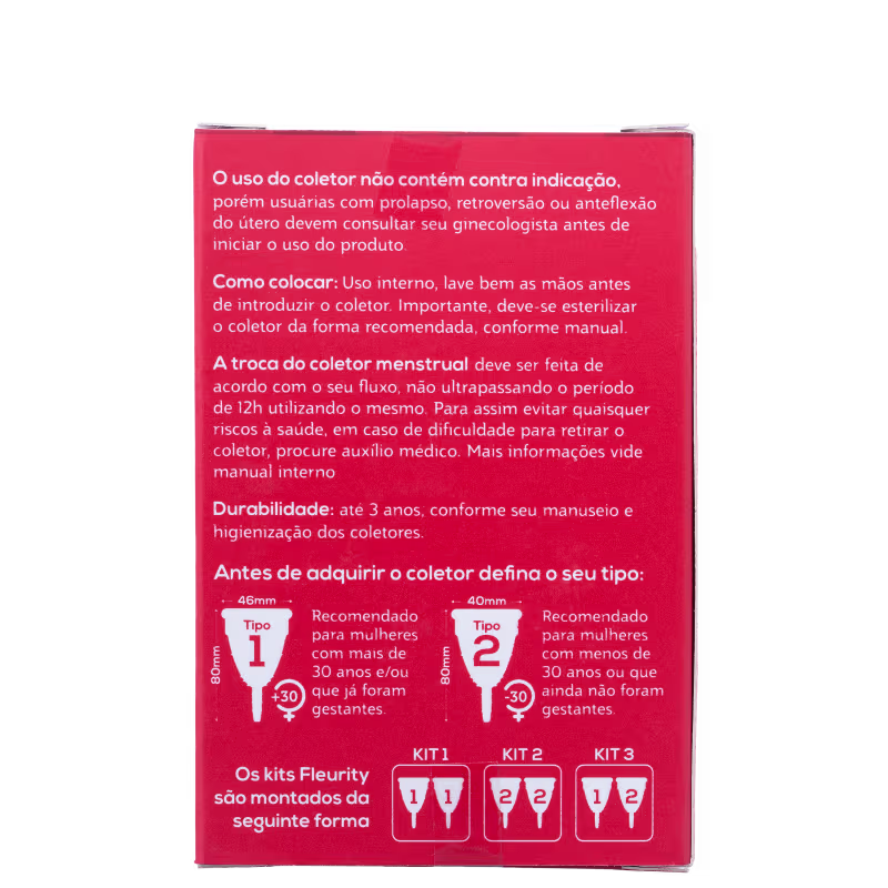 Fleurity Coletor Menstrual Tipo 1 possui 46 mm de diâmetro e tem capacidade total de 28ml. Além disso, é reutilizável e tem vida útil de 10 anos. Traz um kit com dois coletores do tipo 1, um roxo e outro rosa, 1 manual e 1 saquinho de algodão para guardar os copinhos.
