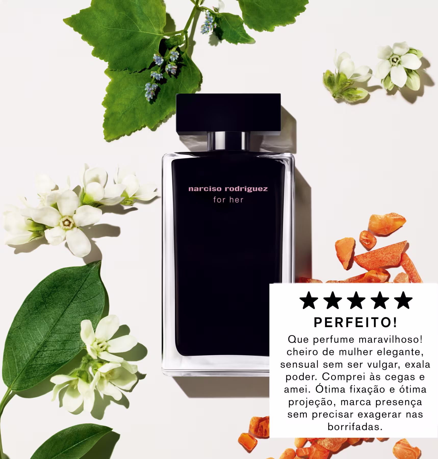 O perfume For Her, de Narciso Rodriguez é a opção perfeita para as mulheres que desejam aflorar a sua beleza interior. O patenteado coração de musc, infundido na fragrância, nos leva a uma verdadeira viagem sensorial. Nele, também é possível encontrar três pulsações olfativas: o "Mel de Flor", almíscar solar, com toques de Flor de Osmanthus e Laranjeira; a "Luz Âmbar", envolvendo Baunilha e Âmbar; e "Madeira", com notas de Vetiver.