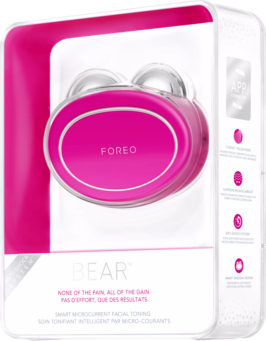 FOREO BEAR combina, em cinco diferentes intensidades, a tecnologia de microcorrente com as conhecidas pulsações T-Sonic da FOREO, e um sistema antichoque exclusivo. A microcorrente é uma tecnologia não invasiva e perfeita para massagear, tonificando, levantando e definindo o contorno do rosto, incluindo queixo, bochechas, pescoço e testa.