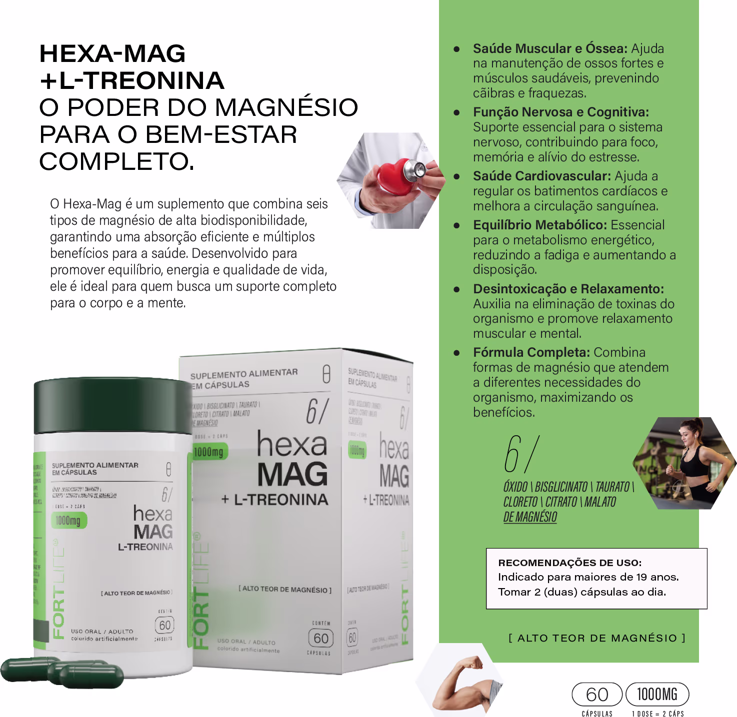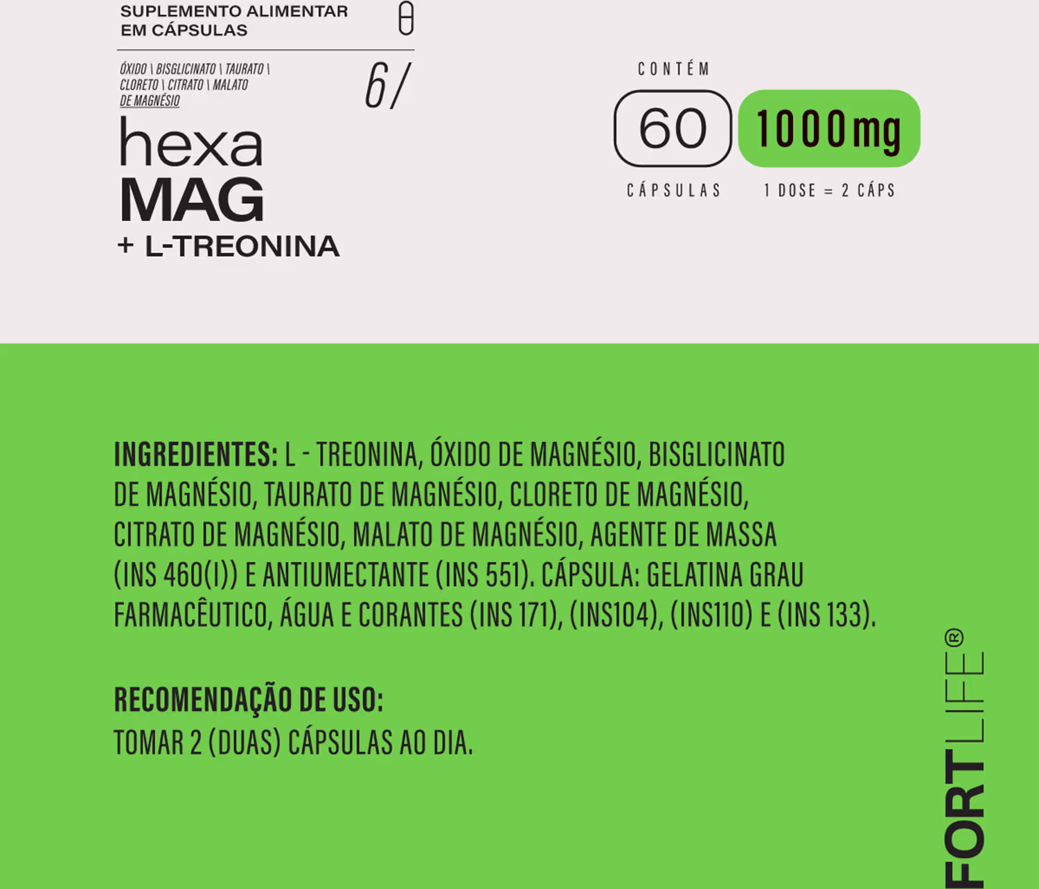 O Suplemento Vitamínico FortLife Pharma Hexa Mag + L-Treonina combina seis tipos de magnésio de alta biodisponibilidade para entregar um suporte completo ao corpo, oferecendo benefícios que vão desde a saúde muscular e óssea até a função nervosa e cognitiva, promovendo foco, energia e equilíbrio; sua fórmula avançada auxilia na regulação cardiovascular, melhora a disposição ao otimizar o metabolismo energético, contribui para o relaxamento físico e mental e ainda apoia processos de desintoxicação.