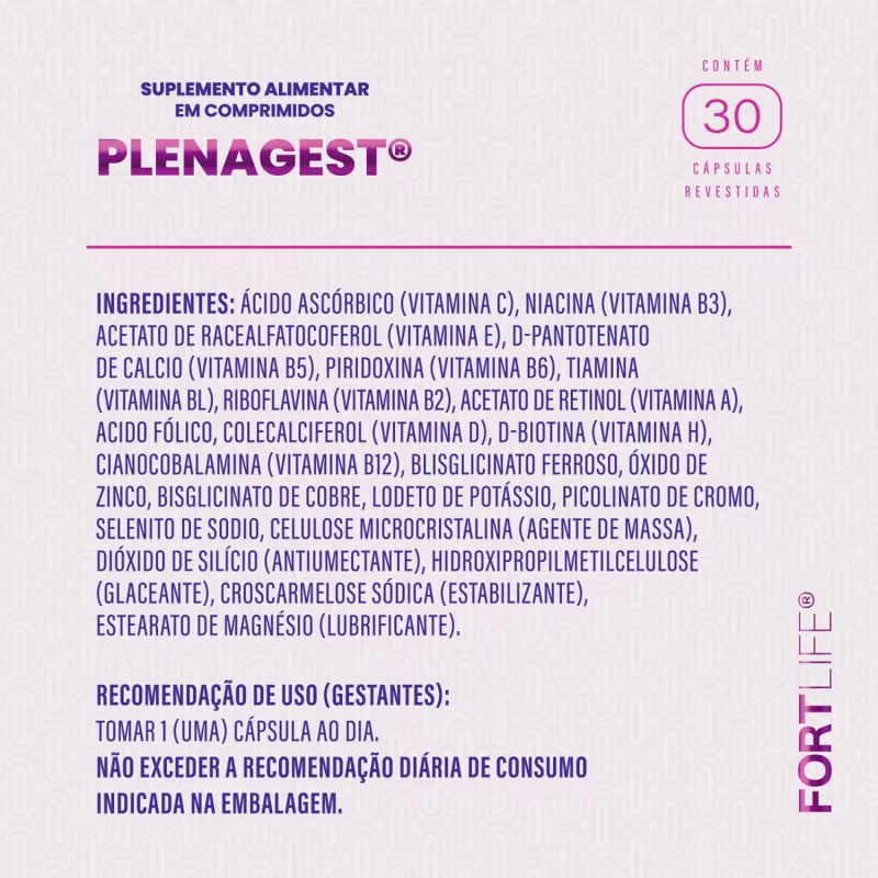 O Suplemento Vitamínico FortLife Pharma Plenagest oferece uma nutrição completa e altamente eficaz para gestantes e lactantes, combinando ácido fólico, ferro, cálcio, vitaminas e minerais em uma fórmula inteligentemente elaborada para apoiar o desenvolvimento saudável do bebê e o bem-estar da mãe; seus ativos atuam na formação adequada do tubo neural, na prevenção da anemia gestacional, no fortalecimento ósseo e na reposição nutricional essencial desse período, entregando mais segurança, energia e equilíbrio em cada fase da gestação e amamentação.
