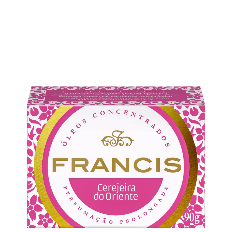 Sabonete em barra. Francis Cerejeira do Oriente desenvolvido com uma espuma cremosa que limpa profundamente sem ressecar o corpo. O sabonete é elaborado através das melhores flores do mundo, em que seus Óleos formam as fragrâncias mais desejadas, originais e únicas, que só Francis fornece!