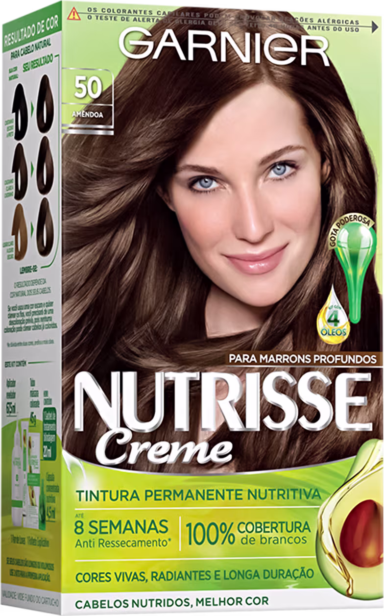 Coloração Garnier Nutrisse Creme oferece 100% de cobertura dos brancos e apresenta tons vibrantes e profundos para deixar seu visual ainda mais moderno. Sua fórmula é composta por 4 óleos nutritivos que combate o ressecamento e proporciona brilho da raiz às pontas. A caixa do produto contém: