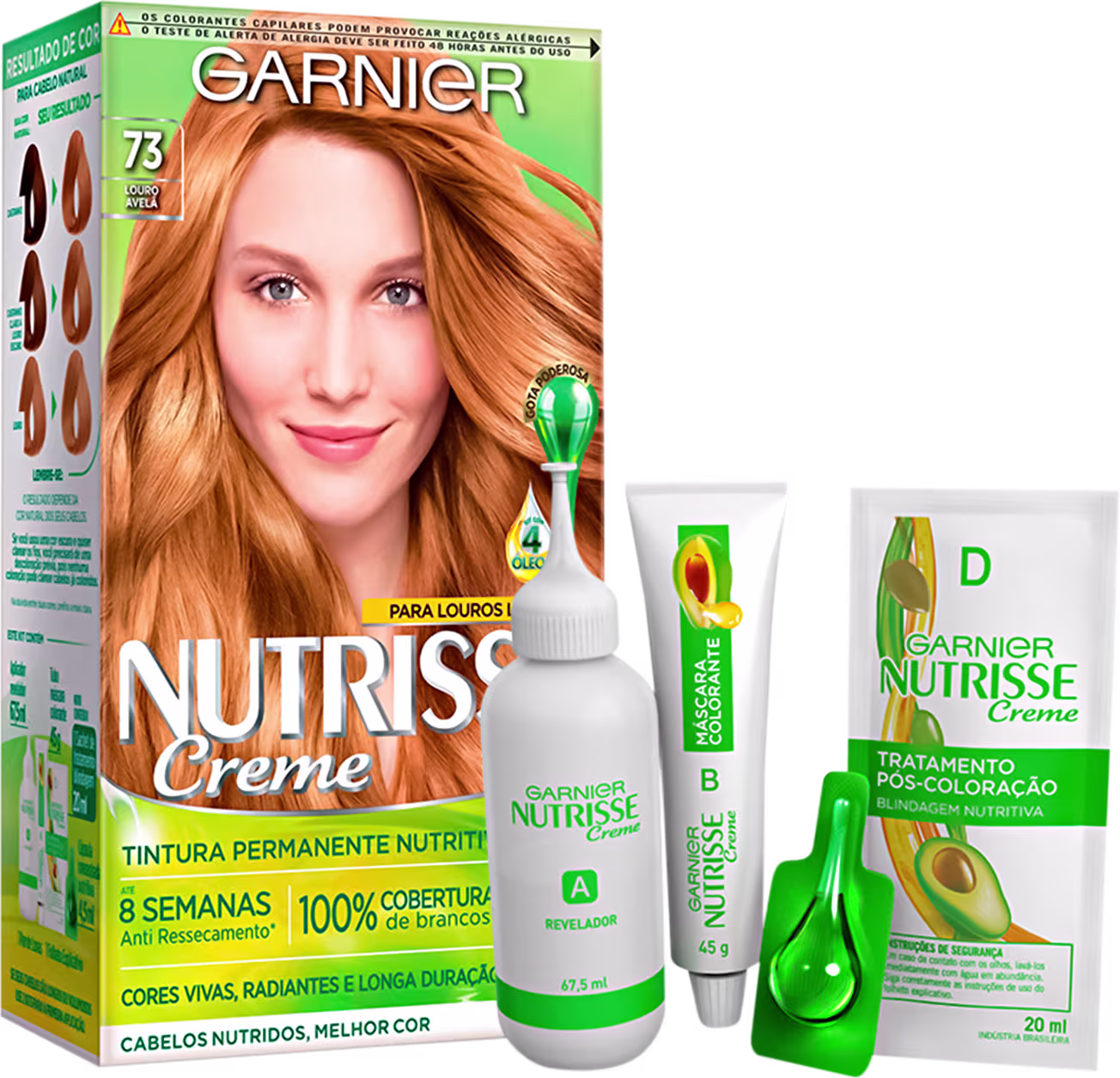 Coloração Garnier Nutrisse Creme oferece 100% de cobertura dos brancos e apresenta tons vibrantes e profundos para deixar seu visual ainda mais moderno. Sua fórmula é composta por 4 óleos nutritivos que combate o ressecamento e proporciona brilho da raiz às pontas. A caixa do produto contém:
