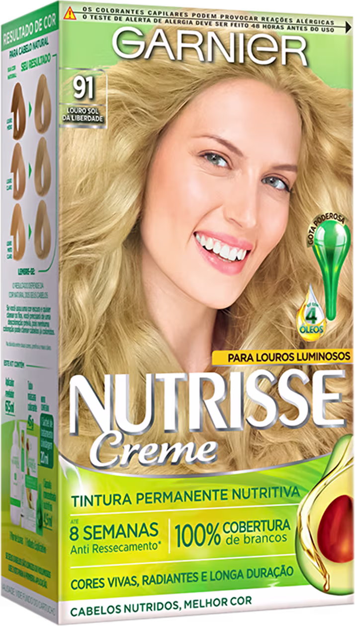 Coloração Garnier Nutrisse Creme oferece 100% de cobertura dos brancos e apresenta tons vibrantes e profundos para deixar seu visual ainda mais moderno. Sua fórmula é composta por 4 óleos nutritivos que combate o ressecamento e proporciona brilho da raiz às pontas. A caixa do produto contém: