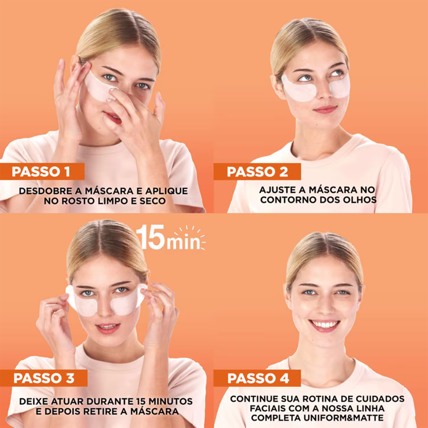 Máscara para a área dos olhos. Garnier SkinActive Hidra Bomb Suco de Laranja e Ácido Hialurônico proporciona hidratação profunda, reduz inchaço e suaviza olheiras.