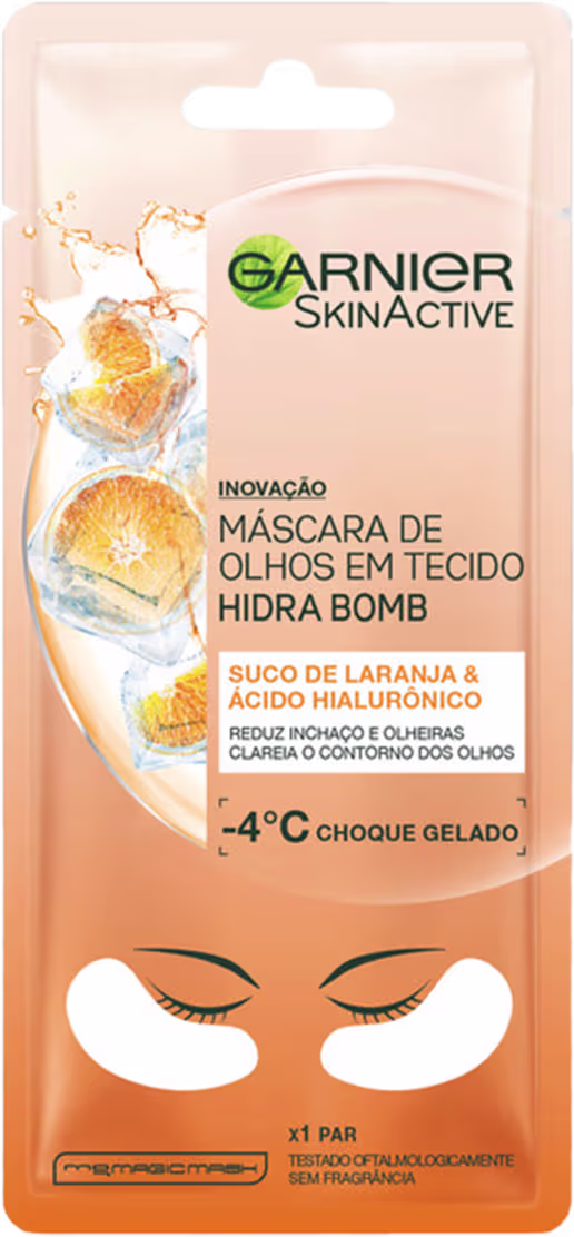 A Máscara de Olhos em Tecido Garnier SkinActive Hidra Bomb Suco de Laranja e Ácido Hialurônico foi desenvolvida para devolver a vitalidade que seus olhos tanto merecem. Sua tecnologia em tecido, com alta concentração de Ácido Hialurônico e Suco de Laranja, ajuda a suavizar olheiras, inchaços, bolsas e clarear o contorno dos olhos, em apenas 15 minutos. Traz tecnologia de efeito choque gelado, com sensação de -4°C na pele após a aplicação para uma sensação ainda refrescante.