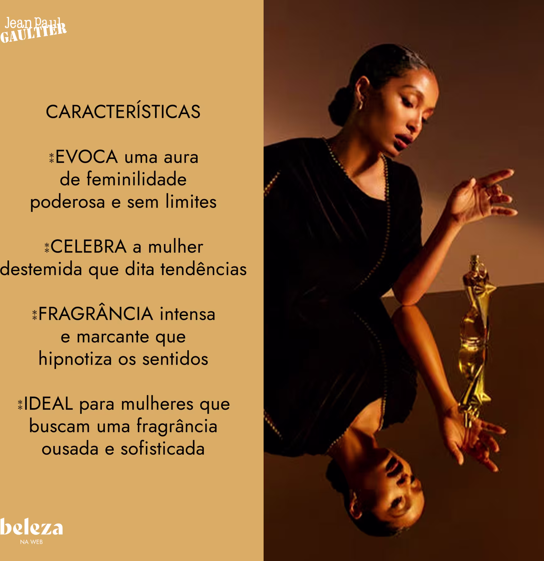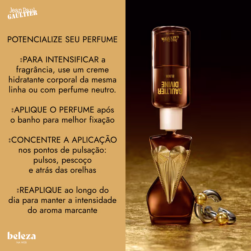 O Perfume Gaultier Divine Elixir, de Jean Paul Gaultier, é uma celebração da feminilidade destemida, trazendo uma fragrância floral marinha com toques ambarados que hipnotizam desde o primeiro instante. A cremosidade intensa da tuberosa encontra a profundidade da fava tonka, criando um contraste magnético e sensual. Vestido em um frasco dourado com reflexos âmbar e o icônico espartilho cintilante, é pura extravagância em forma de perfume. Um tributo à mulher que não segue regras, dita tendências e encanta com presença e poder.