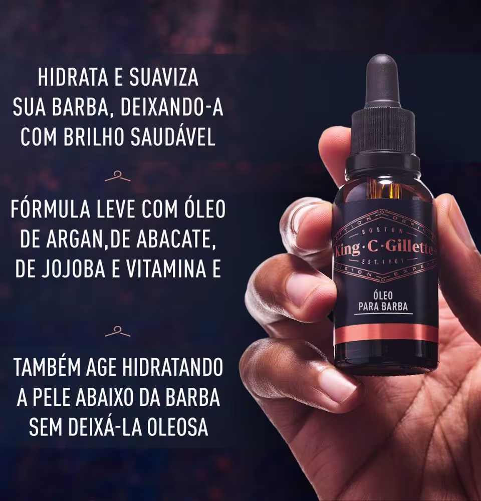 Óleo para barba. Gillette King C. hidrata e suaviza a barba, conferindo um brilho saudável, sem deixar resíduos oleosos.