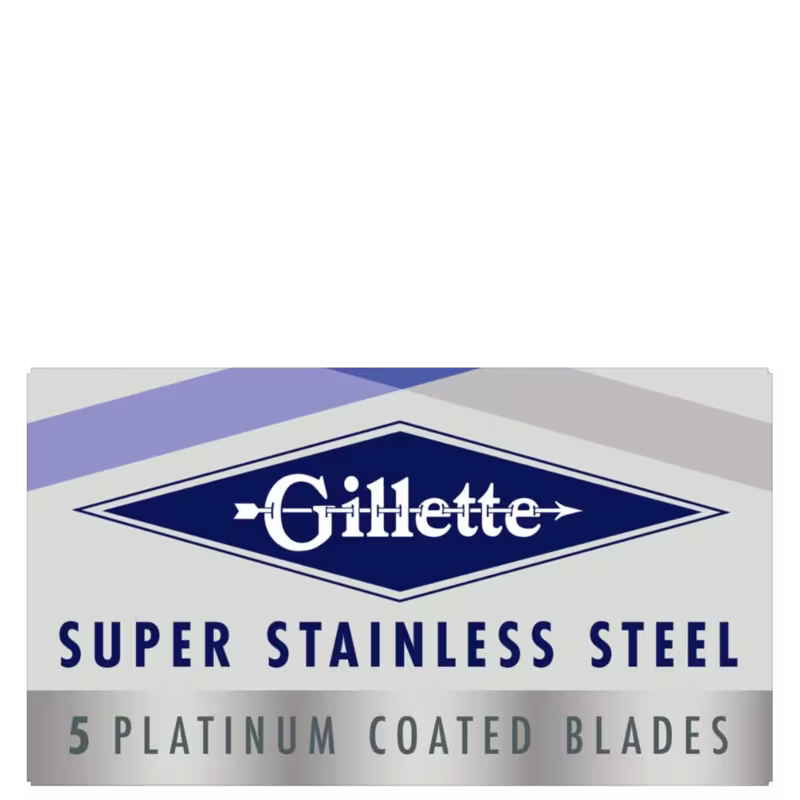 Lâmina de barbear. Gillette Super Stainless Steel, com fio duplo, aço inoxidável, uma camada de Platinum e cobertura antifricção.