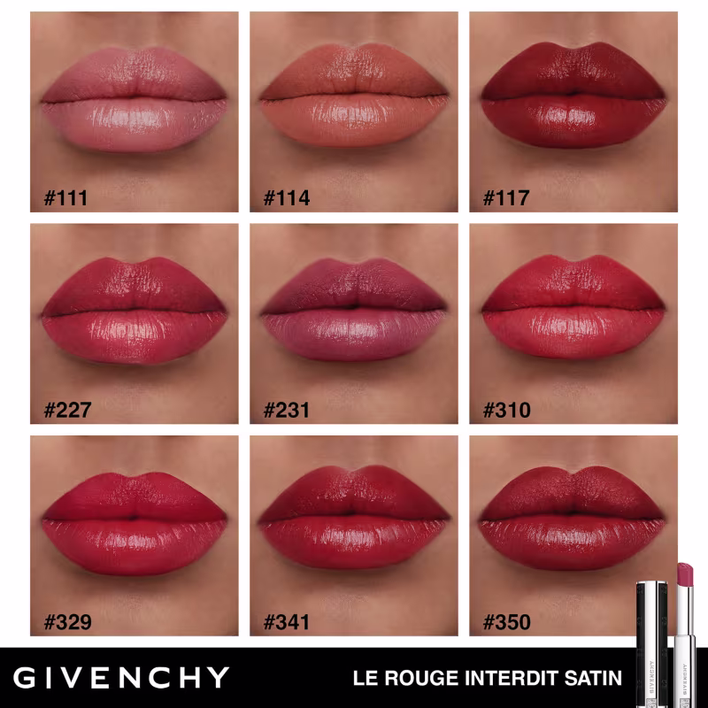 O design elegante de Le Rouge Interdit Satin traz uma silhueta compacta, com couro genuíno, a embalagem é enfeitada com o icônico monograma 4G da marca e bordas prateadas refinadas. Um verdadeiro acessório Givenchy Couture, o bastão do batom também é delicadamente estampado com o logo 4G. Já a paleta de cores, criada pelo Diretor Criativo de Maquiagem da Givenchy, Thom Walker, contém 10 cores elegantes para este batom hidratante. Inspiradas nas peças de alta-costura icônicas da Maison, estas tonalidades ousadas foram projetadas para combinar com todos os tons de pele