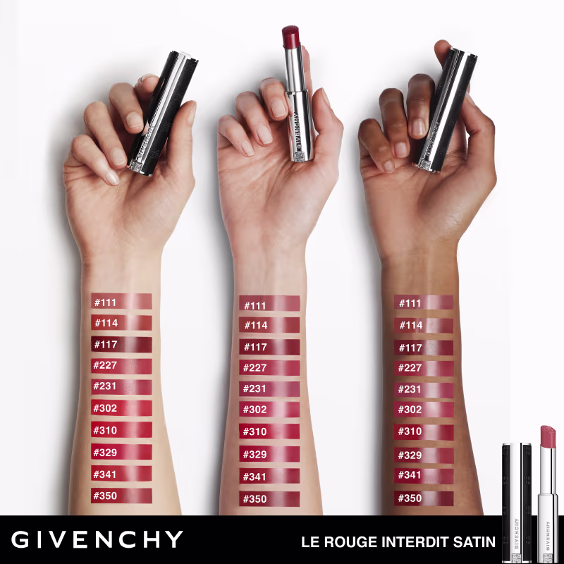 O Batom Givenchy Le Rouge Interdit Satin apresenta uma textura capaz de moldar os lábios com sua fórmula envolvente, com 90% de ingredientes de origem natural, como ácido hialurônico e manteiga de karité, que preenche e suaviza os lábios enquanto uma combinação de pérolas brancas ajuda a fornecer luminosidade duradoura.