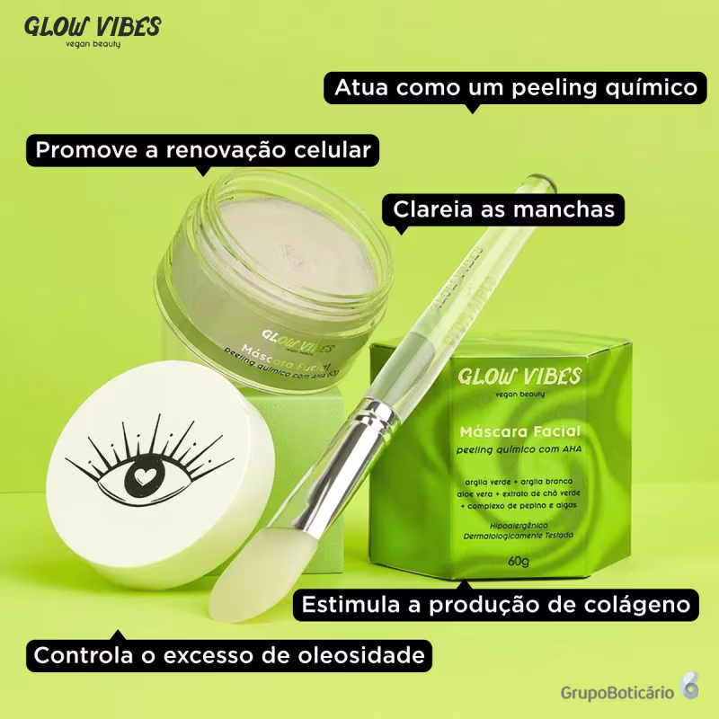 Máscara facial com alfa-hidroxiácidos e argilas para peles mistas e oleosas. A Glow Vibes Peeling Químico com AHA hidrata a pele e combate cravos e espinha, além de combater a oleosidade.