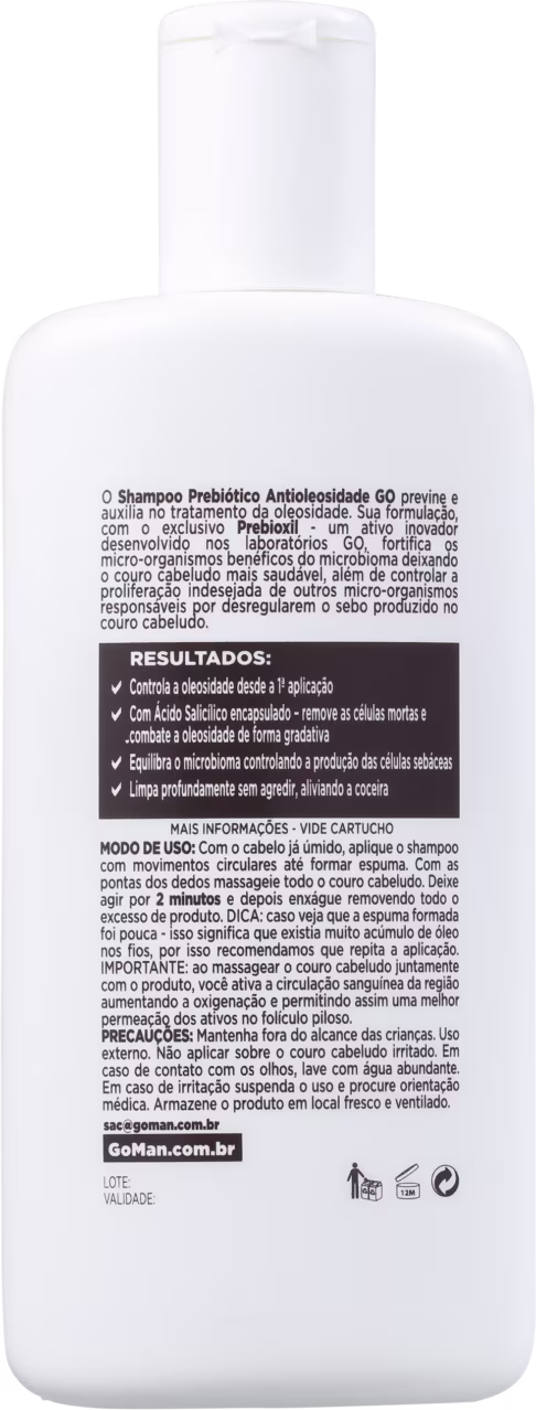 Go Man Prebiótico Shampoo Antioleosidade preserva e fortifica o microbioma saudável da raiz e impede com que os micro-organismos nocivos prejudiquem a pele da região e estimule ainda mais a oleosidade. Tudo isso enquanto garante uma limpeza ideal, sem agredir.