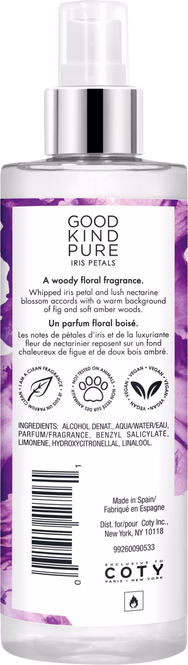 O Body Mist Feminino Good Kind Pure Iris Petals é uma fragrância floral amadeirada. Pétalas de Íris e flores de Nectarina exuberantes combinam com um fundo quente de Figo e madeiras de Âmbar suave.