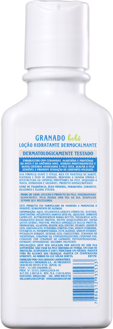 Granado Bebê Dermocalmante Peles Sensíveis Loção Hidratante repara a barreira protetora da pele para evitar o ressecamento ao mesmo tempo em que repõe a umidade natural perdida. Sua fórmula é livre de fragrâncias, corantes, óleo mineral e parabenos.