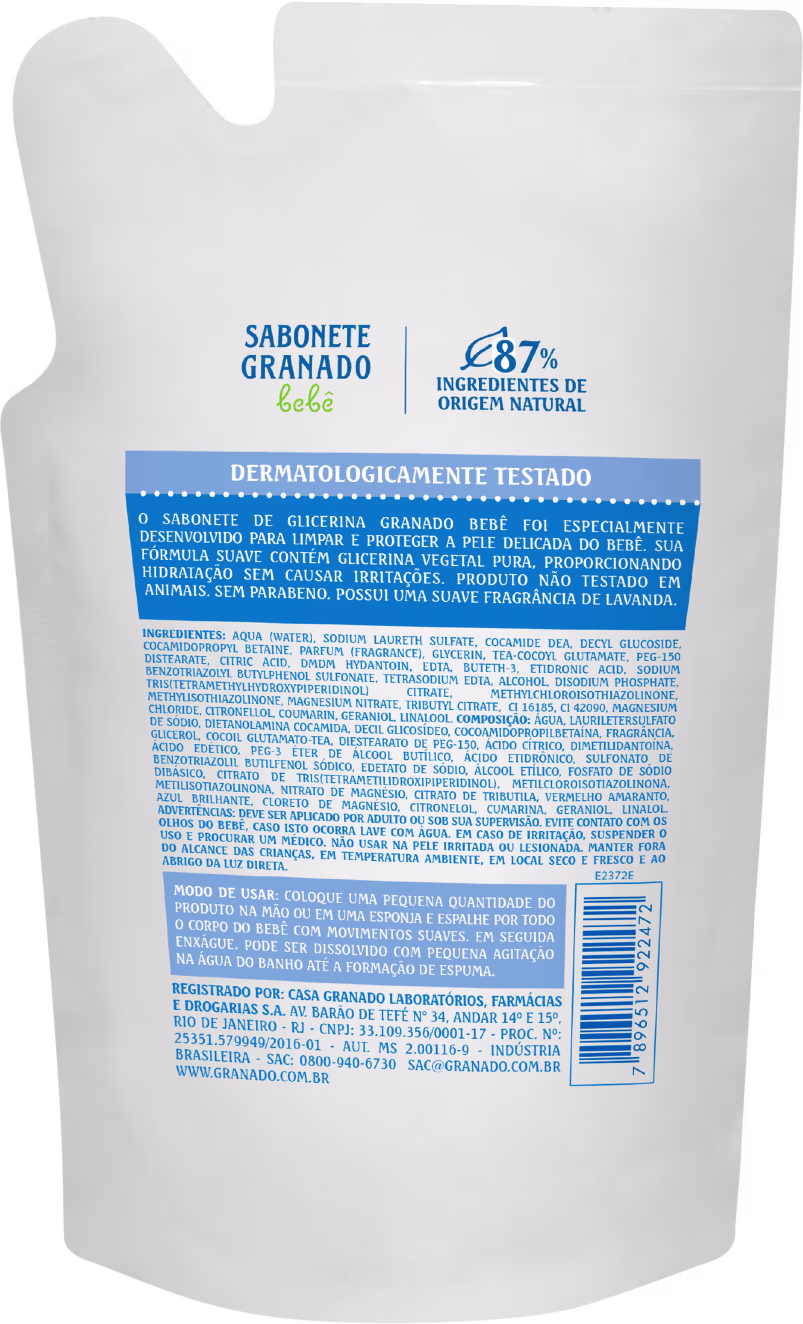 Com base em vegetal, Granado Bebê Lavanda Sabonete Líquido Refil possui um pH compatível com a pele do bebê, além de ser hipoalergênico, ou seja, minimiza a possibilidade de reações alérgicas.