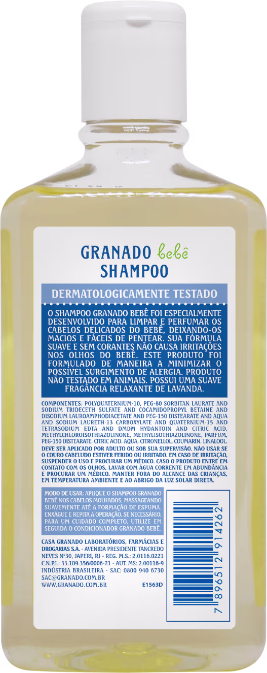 Testado dermatologicamente, Granado Bebê Lavanda ajuda a proteger e cuidar da pele do nenê, mantendo o viço natural. Com a fragrância que relaxa, os fios ficam limpos, macios e fáceis de pentear.