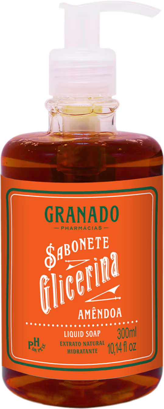Sabonete Granado Glicerina Amêndoa Líquido deixa a pele macia e perfumada graças à ação umectante da amêndoa. Por ter fórmula suave, pode ser utilizado diariamente.