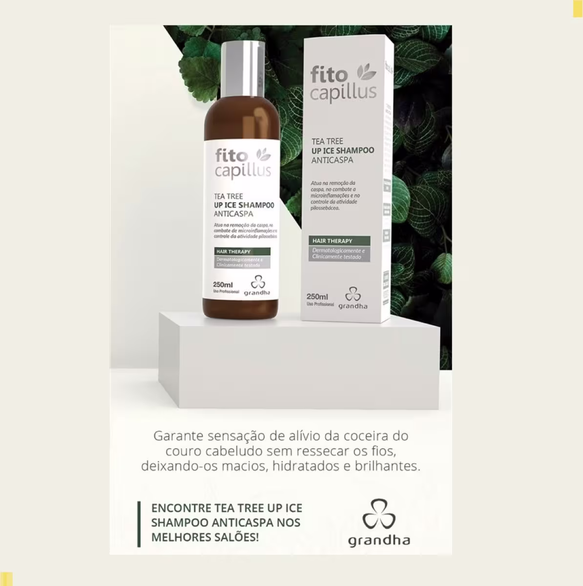 Shampoo anticaspa. Grandha Fito Capillus Tea Tree Up Ice limpa o couro cabeludo com delicadeza, controlando a oleosidade com eficiência.