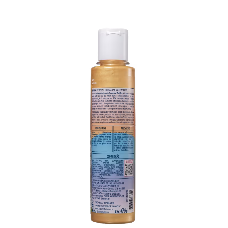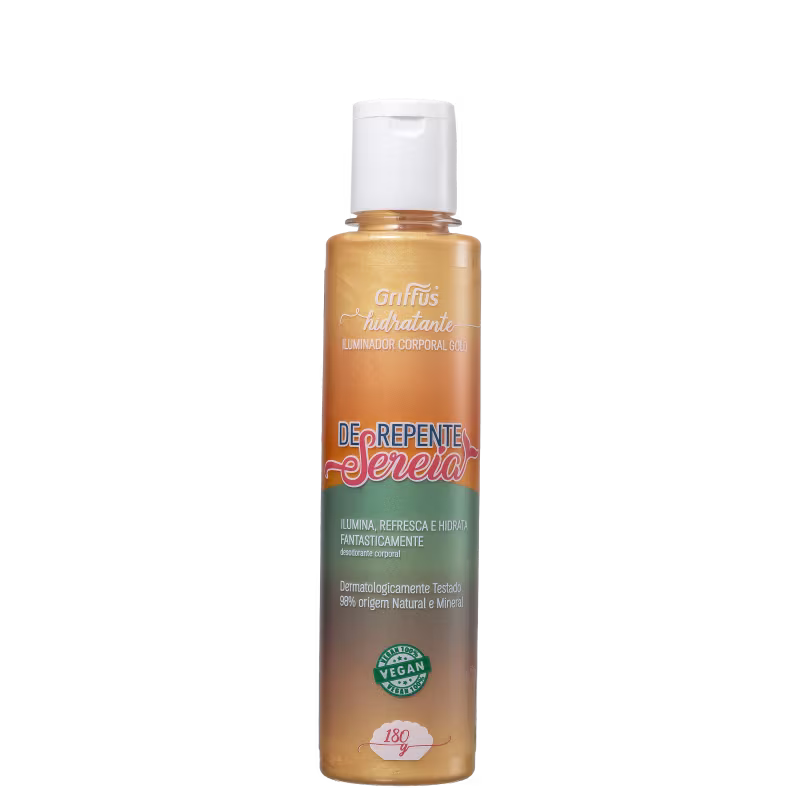 O Hidratante Iluminador Corporal Griffus De Repente Sereia possui uma textura não pegajosa, que não mancha a roupa e garante um brilho bronzeado. Além disso, pode ser usado como pós-sol, trazendo uma sensação refrescante e acalmando a derme.