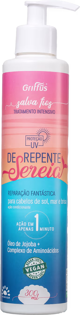 Tratamento para cabelos expostos ao sol, mar e cloro. Griffus De Repente Sereia Tratamento Intensivo repõe a umidade perdida para devolver o brilho e a maciez em apenas 1 minuto.