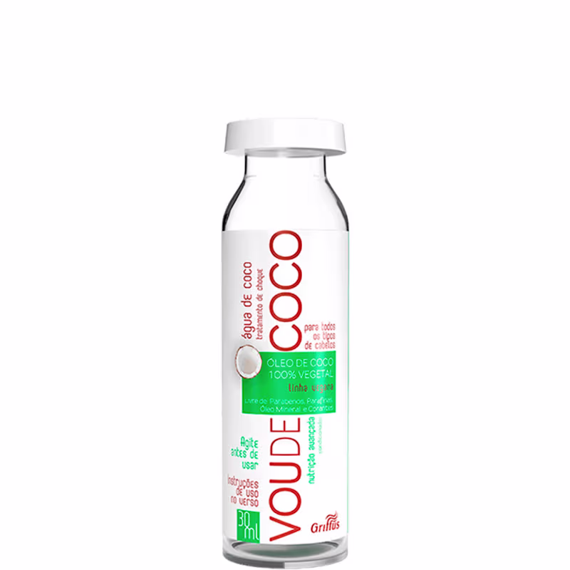 Ampola capilar para cabelos extremamente danificados. Griffus Vou de Coco proporciona tratamento de choque aos fios.