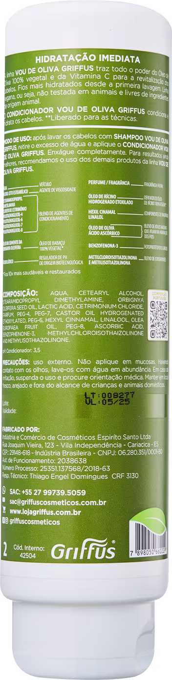 Condicionador para todos os tipos de cabelo. Griffus Vou de Oliva hidrata, recupera a vitalidade, fortalece e protege do envelhecimento precoce, causado pelas agressões ambientais, térmicas e químicas.