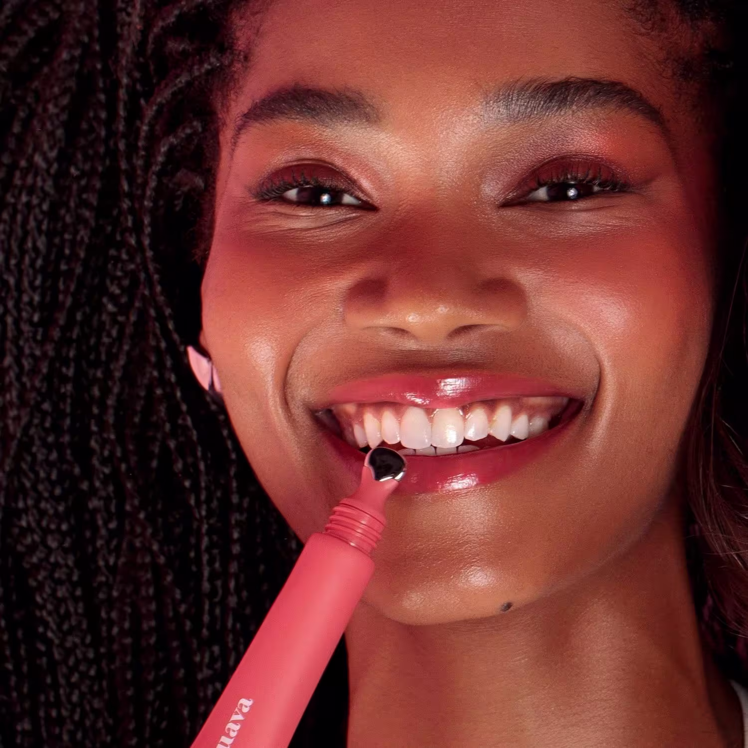 Tubo de óleo labial na cor coral com rótulo da marca Guava. O produto possui um aplicador com formato cilíndrico e textura lisa, sugerindo tratar-se de um item de cuidados com a pele.