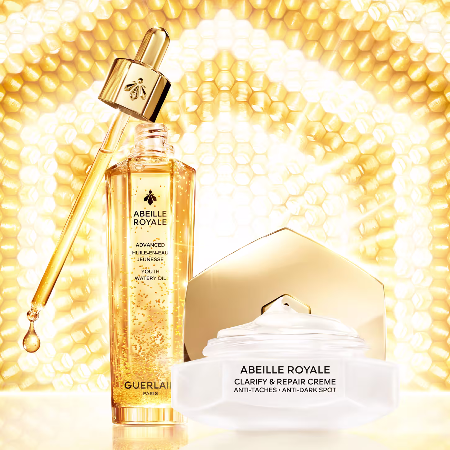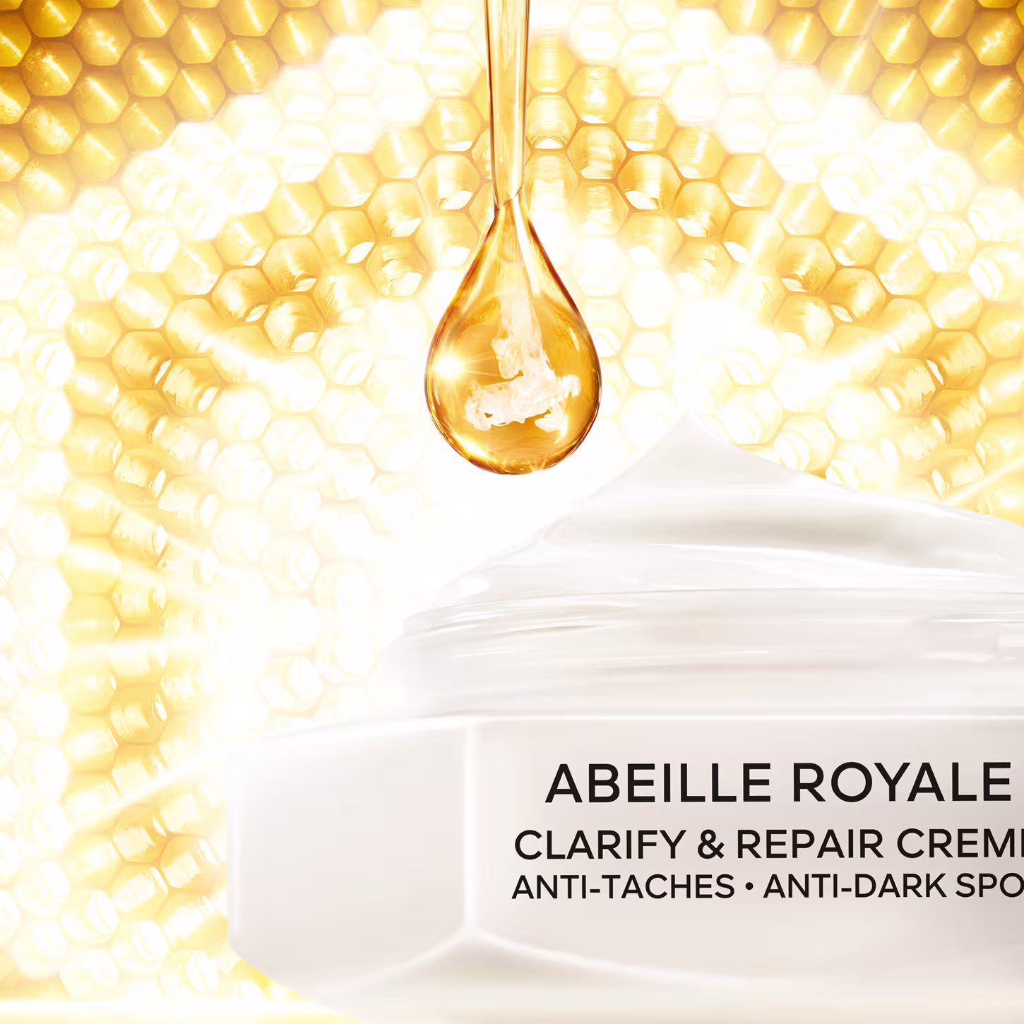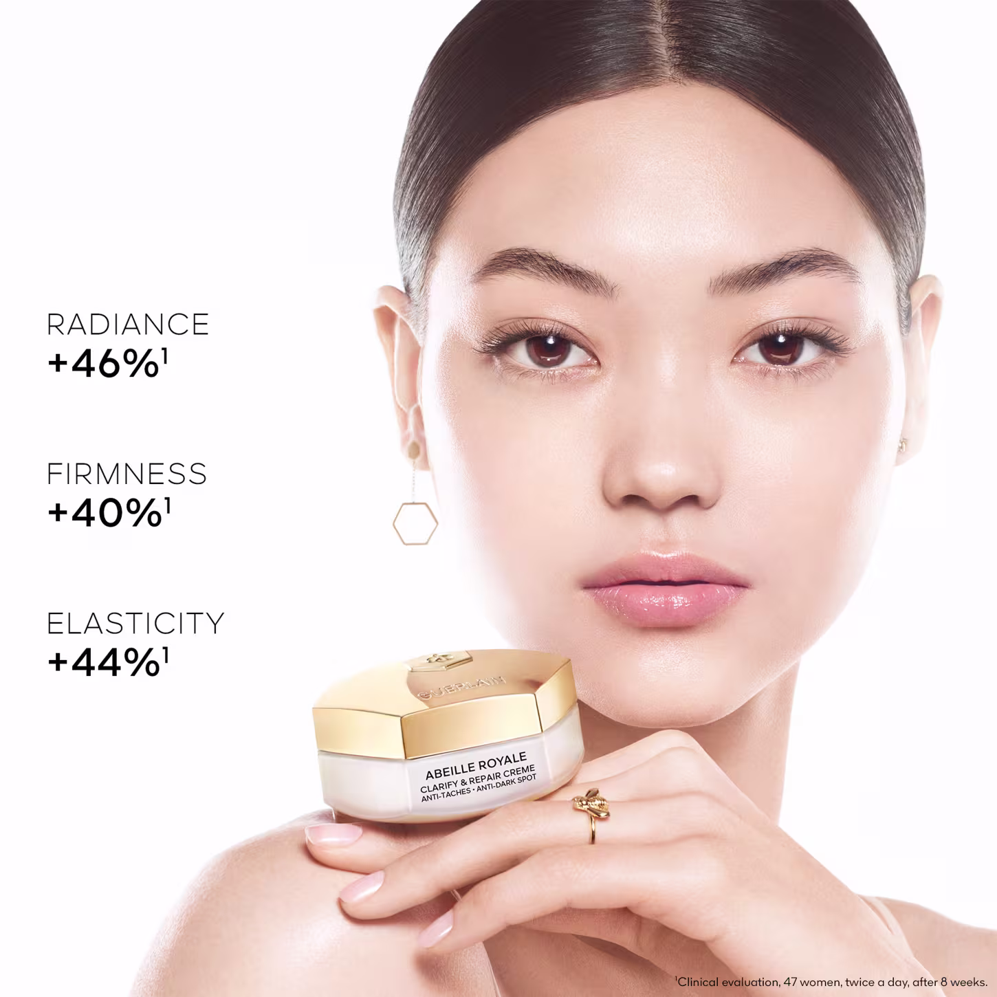 O Creme Hidratante Redutor de Marcas Guerlain Abeille Royale Clarify & Repair Refil é formulado com 93% de ingredientes de origem natural, enriquecido com os poderosos méis da tecnologia Dynamic Blackbee Repair, com um concentrado ativo da luminosidade que combina vitamina C para combater as marcas escuras e o mel branco restaurador da luminosidade. O resultado é uma pele uniformizada, com textura revitalizada, rugas suavizadas e a pele visivelmente mais jovem. Com esse creme hidratante é possível realizar o ritual uniformizador e reparador Abeille Royale, composto, além do creme hidratante, pelo Óleo Rejuvenescedor Avançado que repara a pele 9 vezes mais depressa, promovendo preenchimento e suavidade.
