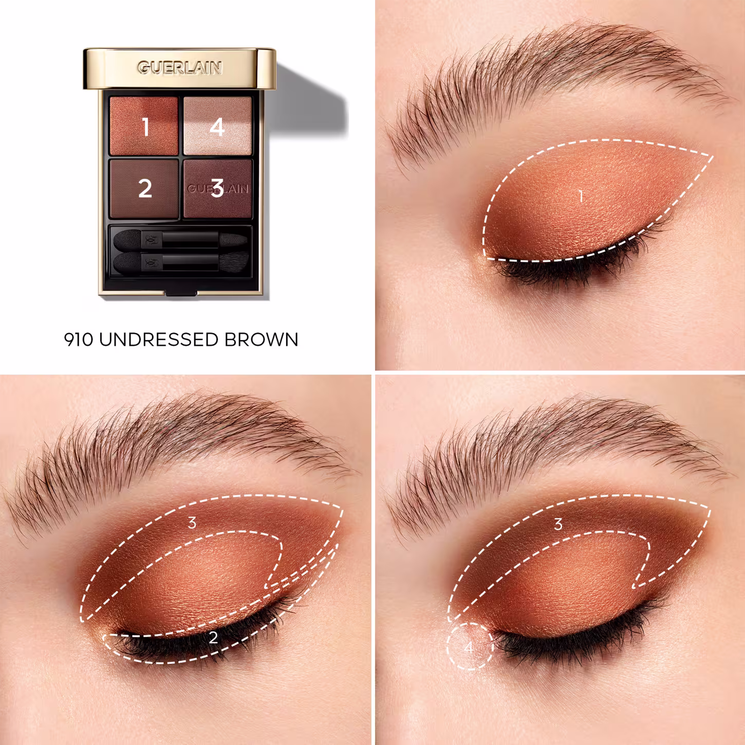 A Paleta de Sombras Guerlain Ombres G conta com uma textura excepcional composta por pigmentos intensos, que garantem longa duração da cor. As sombras deslizam facilmente sobre a pálpebra e podem ser misturadas conforme desejado para criar vários efeitos. A paleta contém quatro acabamentos diferentes: cetim intenso, matte profundo, metálico luminoso e perolado radiante.