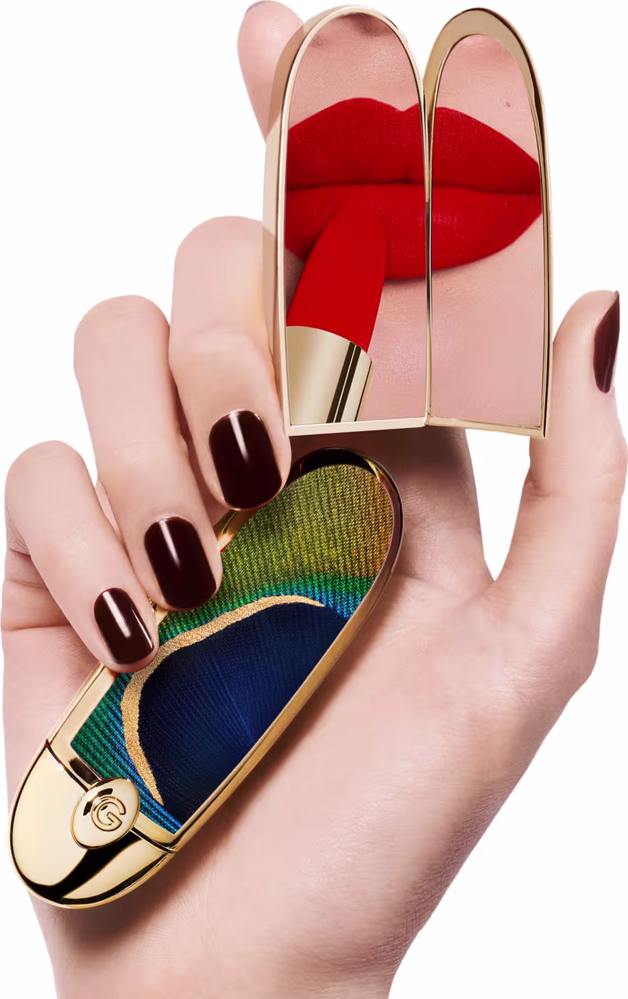 O Case de Batom Guerlain Rouge G Majestc Feathers Peacock apresenta um deslumbrante trabalho com cristais, oferecendo uma personalização sofisticada para o seu batom favorito. Com design exclusivo e espelho duplo integrado, combina luxo e praticidade, permitindo retoques de maquiagem a qualquer momento e em qualquer lugar.