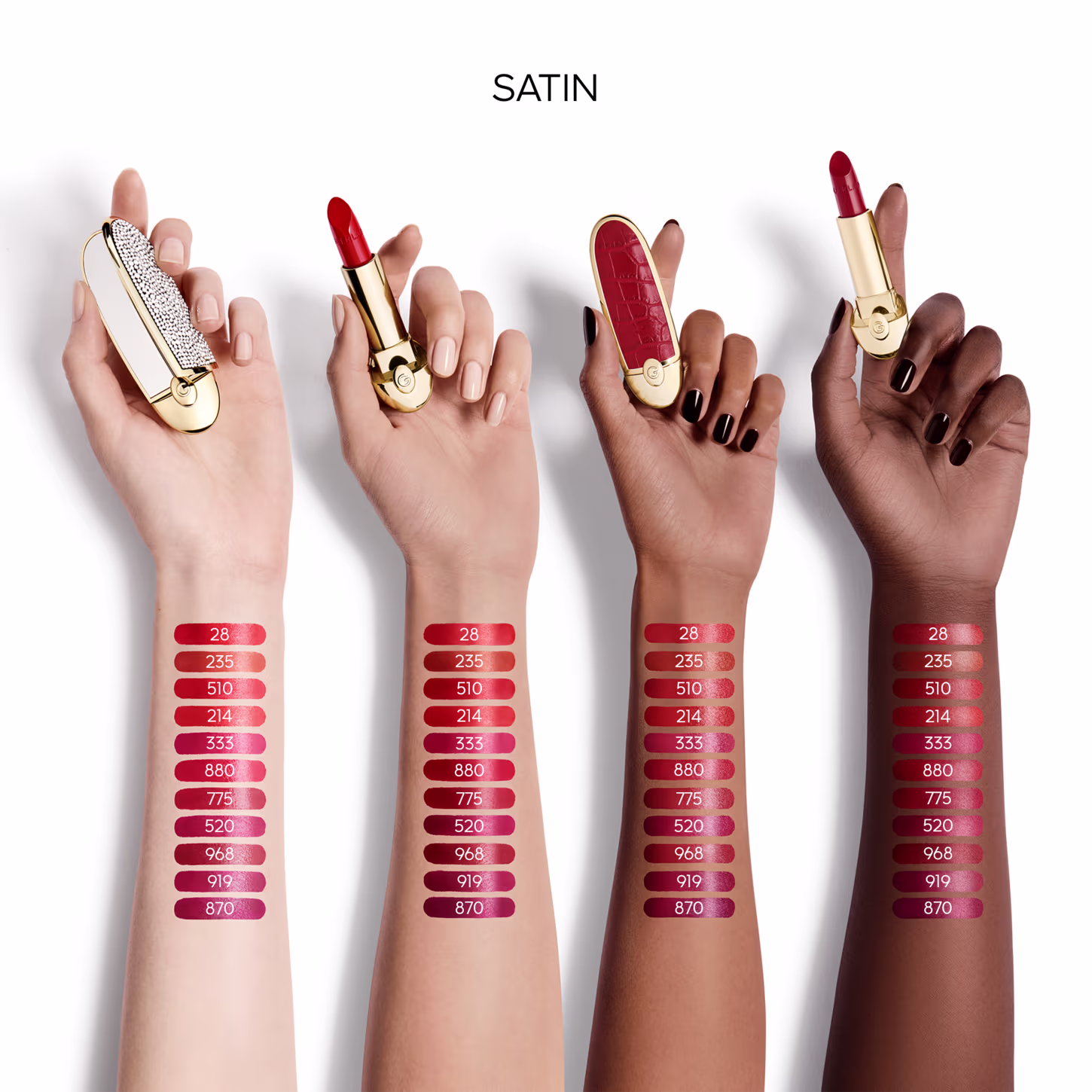 Batom com acabamento acetinado. Guerlain Rouge G Satin possui cores intensas e luminosas que envolvem seus lábios como uma joia para um visual deslumbrante. O primeiro batom customizado da marca, que acomoda seu tom favorito em cases incríveis para uma maquiagem com toque único como você!
