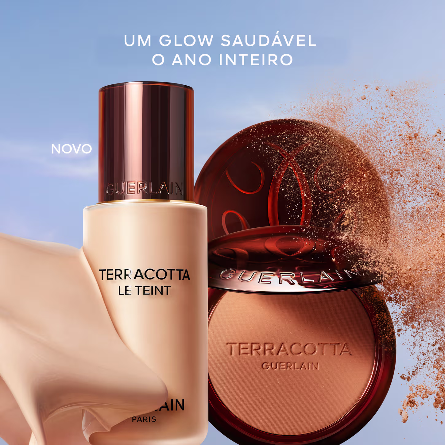 A Base Líquida Guerlain Terracotta Le Teint possui fórmula arejada, baseada em pigmentos de origem natural e infundida com Óleo de Argan natural que, funde-se com a pele e é incrivelmente leve de aplicar, proporcionando uma cobertura média a alta, feita sob medida e ultraconstruída. As partículas de pó aperfeiçoadoras integradas à fórmula criam instantaneamente um acabamento fosco luminoso impecável, mas inacreditavelmente natural. E assim, ela garante uma pele fresca e luminosa, o famoso brilho bonito e saudável, como se você tivesse acabado de voltar de uma escapada ao ar livre.