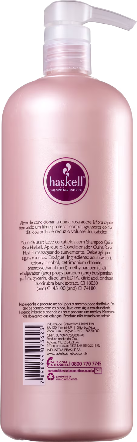 Condicionador em tamanho profissional para cabelos danificados. Condicionador Haskell Quina Rosa restaura, protege e reduz o volume dos fios.