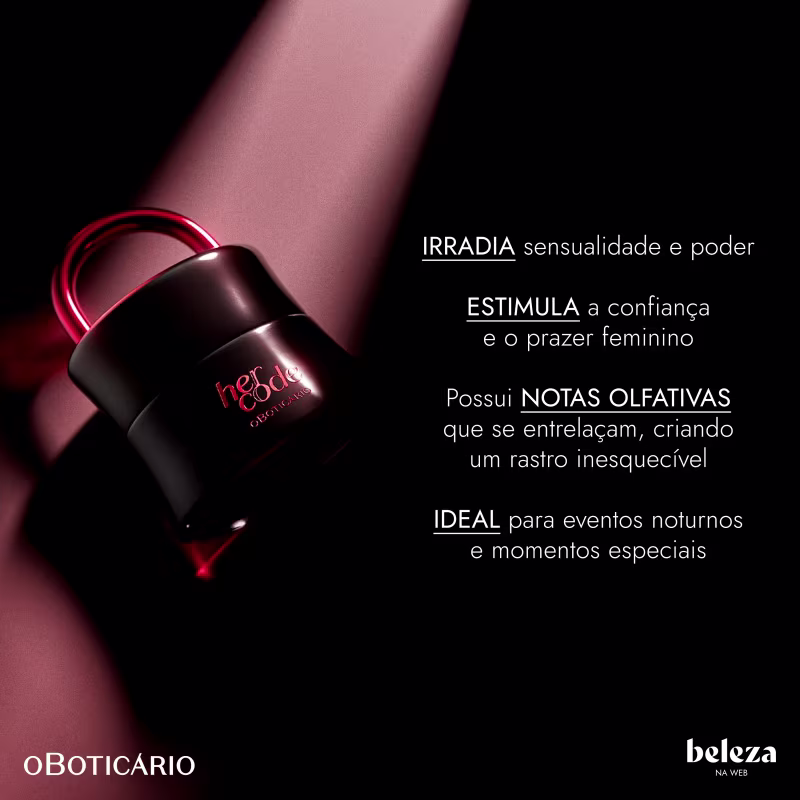 Este amadeirado feminino combina o exclusivo Código Secreto, acorde olfativo único e instigante, ao prazer aditivo do Chocolate Noir*, que comprovadamente desperta a água na boca, envolvidos pela feminilidade e à força do Sândalo, revelando nuances misteriosas, intensas e inebriantes que estimulam o prazer feminino.