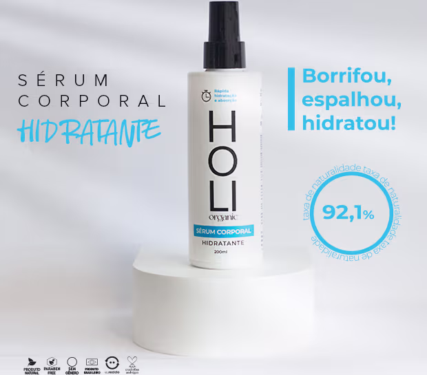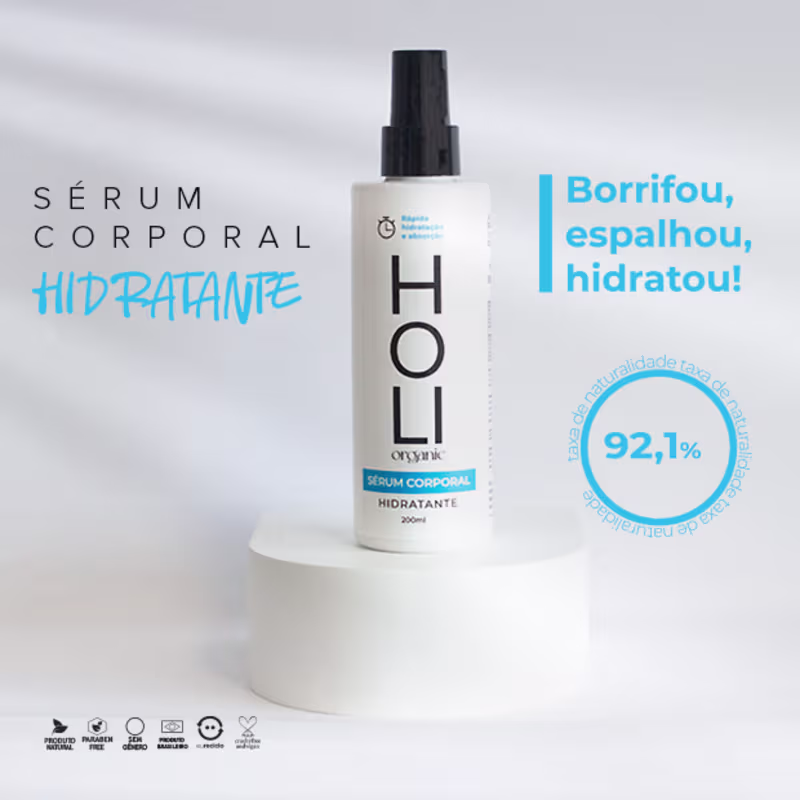 Não sei o CEPSérum corporal hidratante. Holi Organic promove uma aplicação em spray fácil e prática que hidrata a pele intensamente, perfeito para quem tem preguiça de passar hidratante no corpo na rotina.