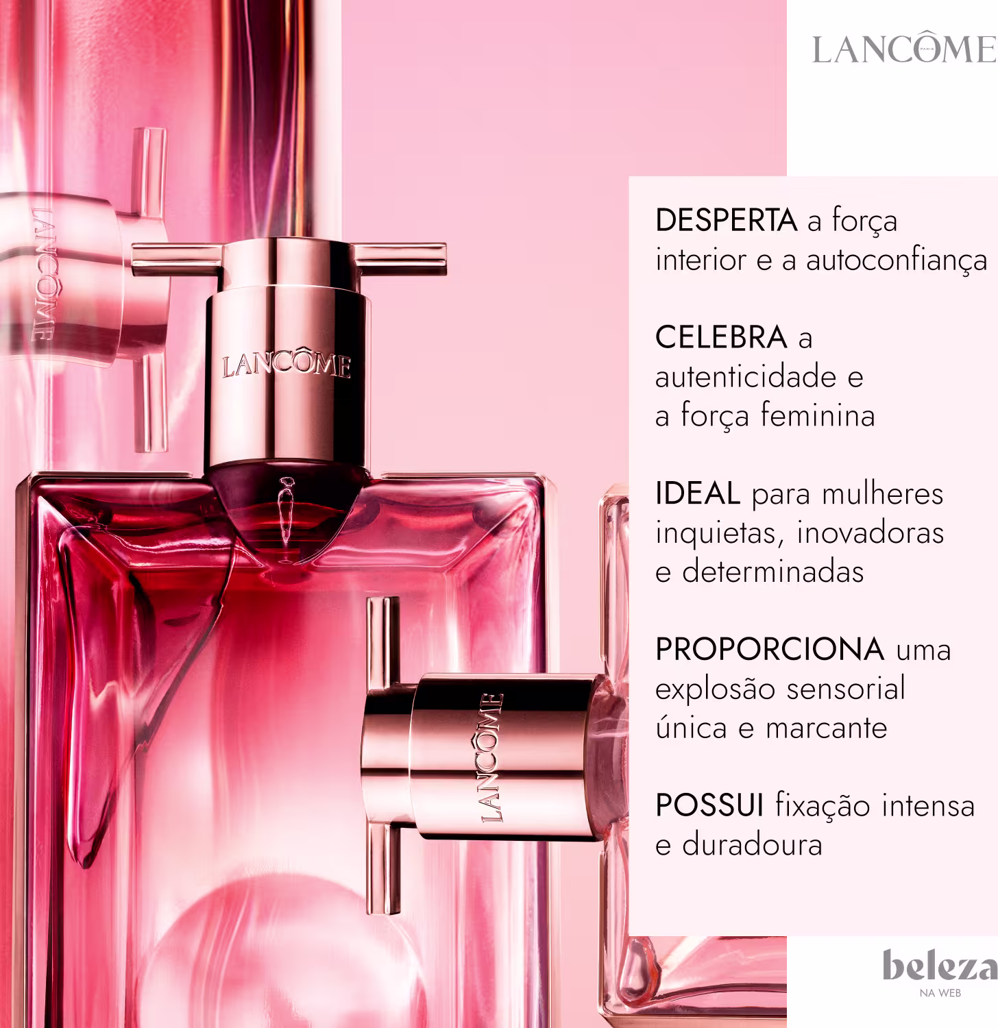 O Perfume Importado Idôle Power, de Lancôme, é uma celebração da autenticidade e da força feminina, criado para mulheres inquietas, inovadoras e determinadas a transformar o mundo. A fragrância revela uma explosão sensorial: abre com a doçura viciante da maçã vermelha caramelizada e da Pomarose™, trazendo frescor e energia vibrante; no coração, a Rosa Damascena floresce com feminilidade e intensidade; e, no fundo, o sândalo cremoso confere um toque sensual e duradouro.