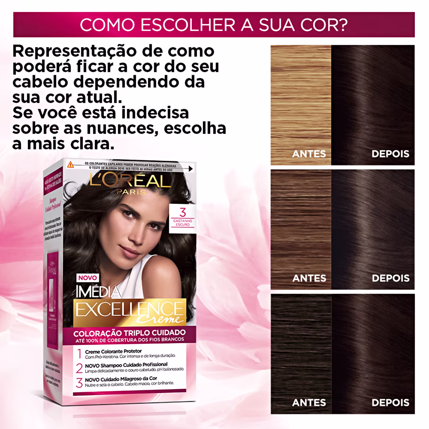 Coloração Imedia Excellence Creme apresenta triplo cuidado e proteção aos fios graças aos seus ativos reparadores, como a Pro-Keratina e Ceramida que fortalecem e restauram a saúde do cabelo. Perfeita para colorir intensamente, mudar seu visual e ainda oferecer um aspecto saudável aos fios.