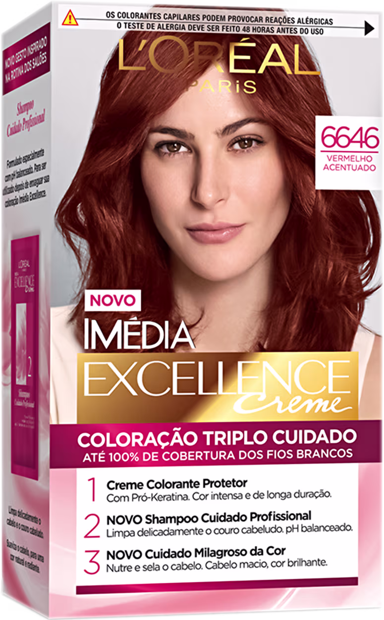 Coloração Imedia Excellence Creme apresenta triplo cuidado e proteção aos fios graças aos seus ativos reparadores, como a Pro-Keratina e Ceramida que fortalecem e restauram a saúde do cabelo. Perfeita para colorir intensamente, mudar seu visual e ainda oferecer um aspecto saudável aos fios.