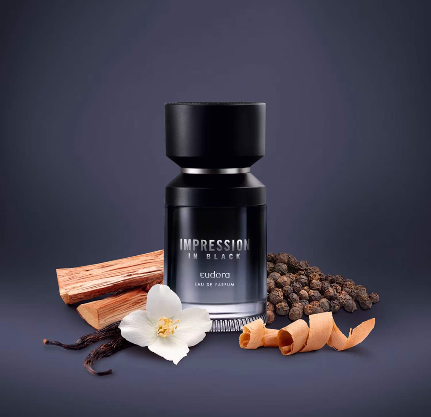 Impression In Black é um eau de parfum Eudora masculino amadeirado especiado. Fragrância que envolve com notas de couro, bálsamo e especiarias.