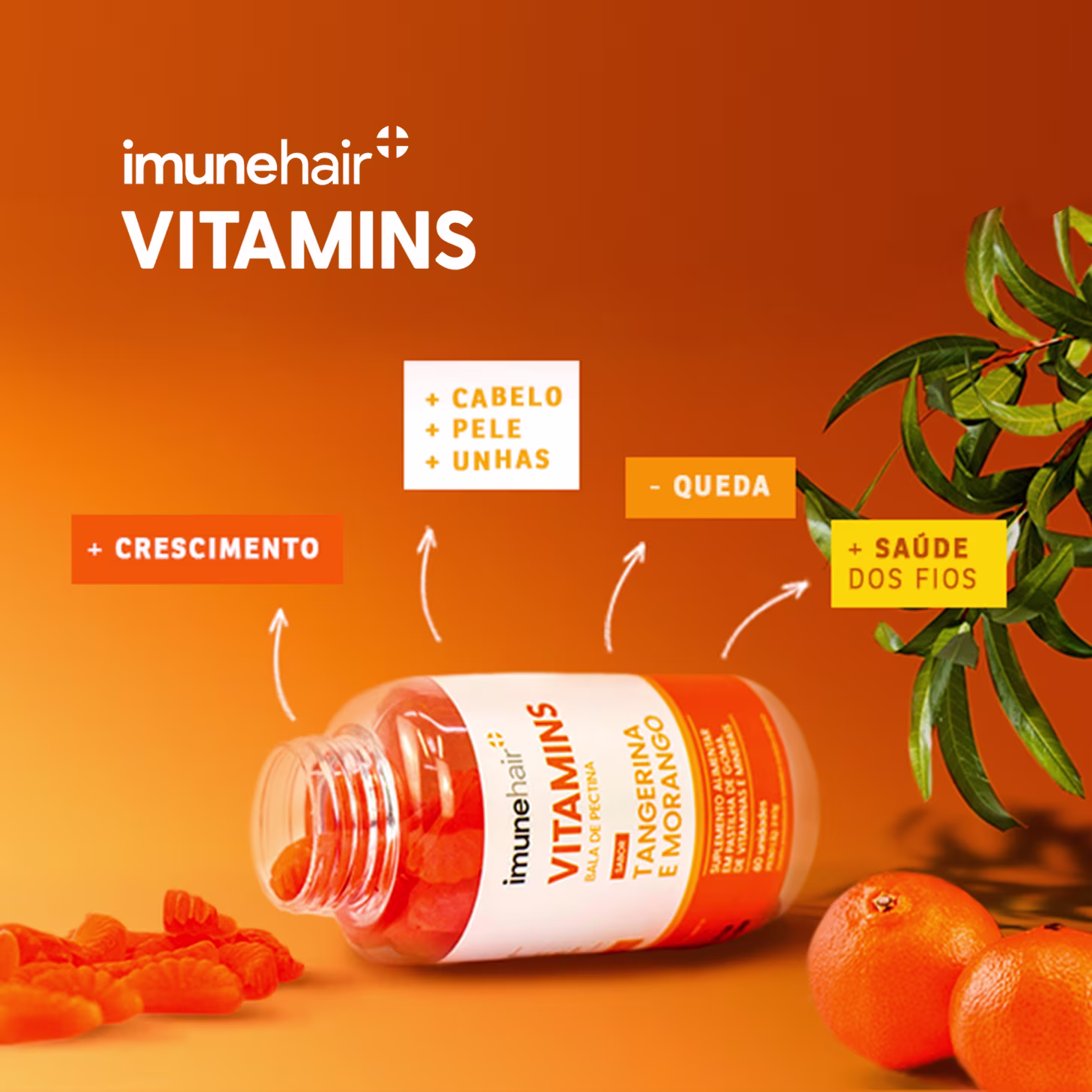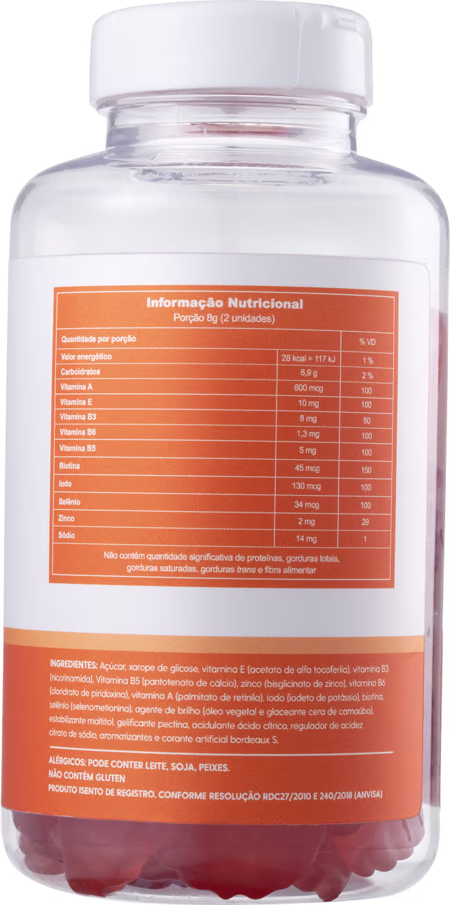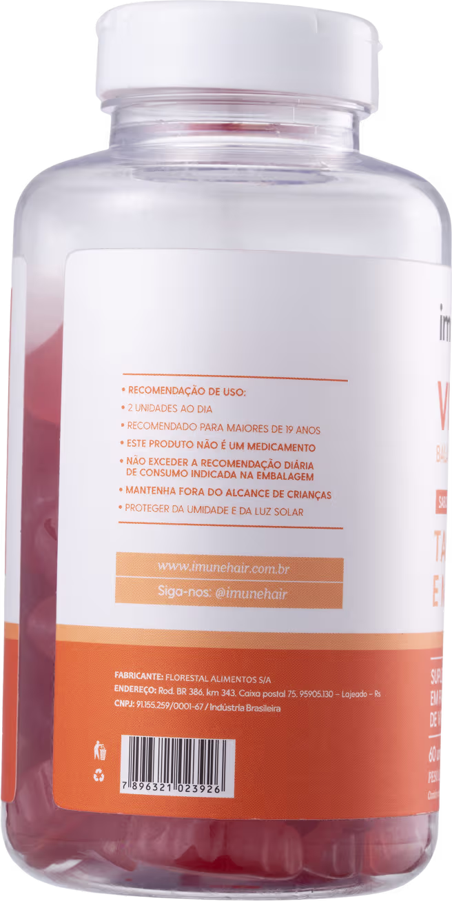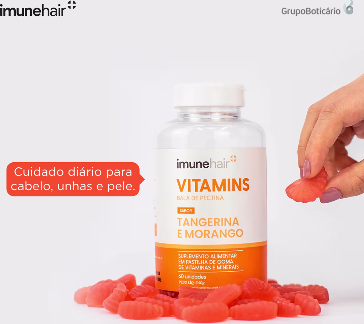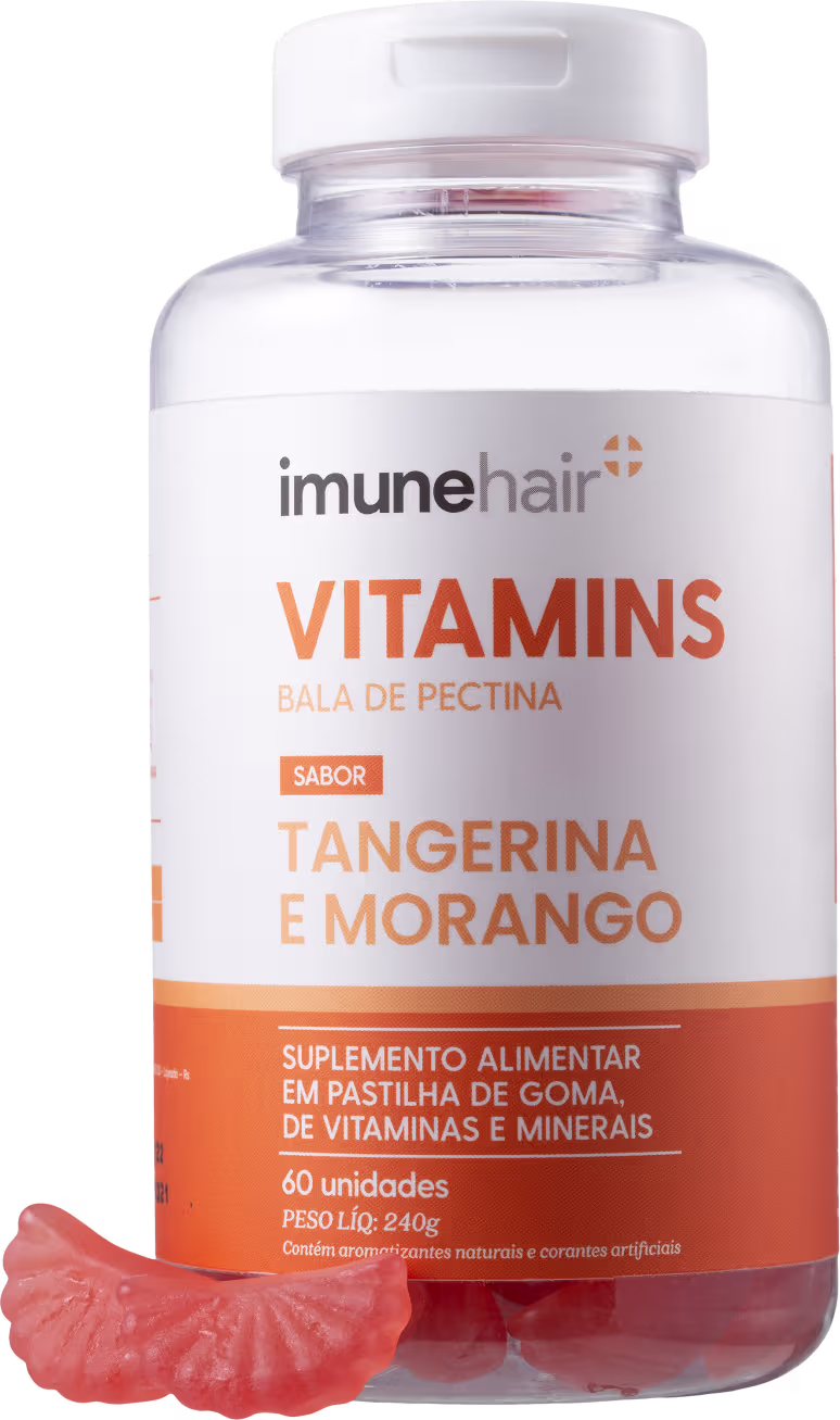 Suplemento alimentar em pastilha de goma, de vitaminas e minerais. Imunehair Vitamins Bala de Pectina oferece um cuidado diário para a saúde dos cabelos, da pele e das unhas.