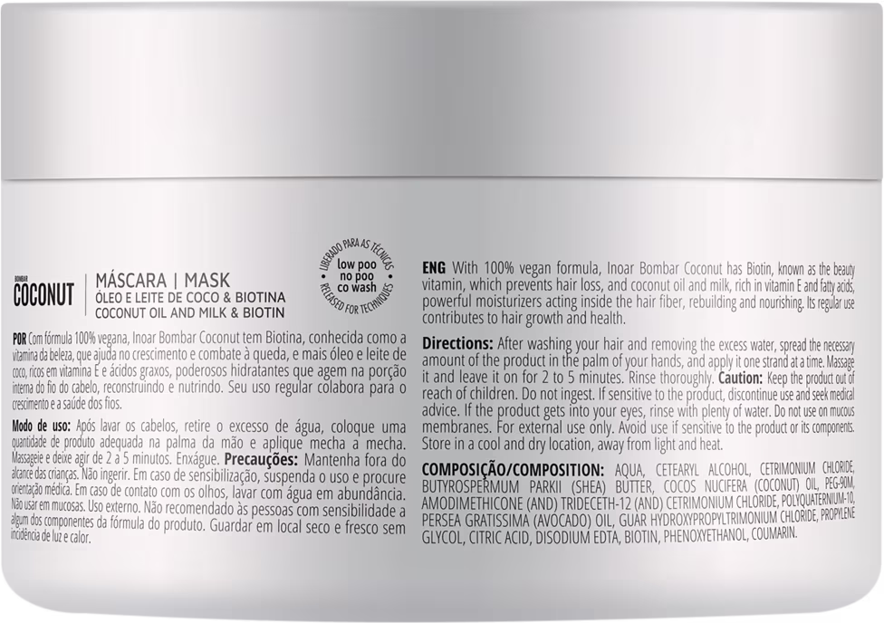 A linha Inoar #Bombar Coconut conta com o óleo de coco que é um poderoso hidratante e age internamente no fio. Rica em Biotina que ajuda a combater à queda e deixa os cabelos naturalmente mais saudáveis.