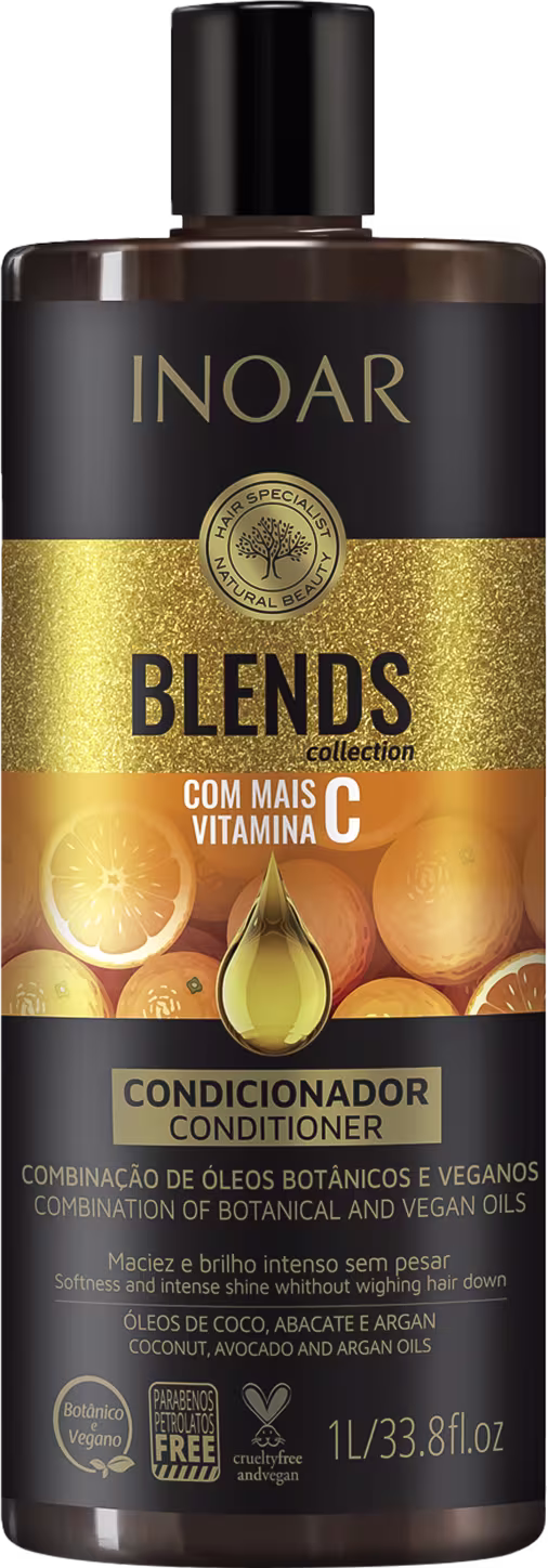 A fórmula do Condicionador Blends Inoar é rica em Vitamina C, que trata os fios durante sua rotina diária de cuidado pessoal. Assim, consegue resgatar o aspecto saudável e bonito do cabelo enquanto protege do ressecamento e das agressões externas.