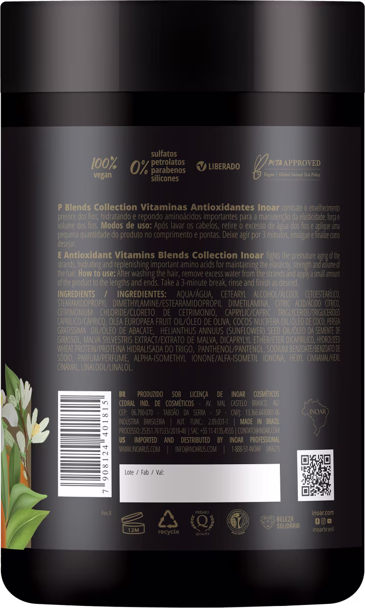 A Máscara Capilar Inoar Coleção Blends, da Inoar, é rica em Vitamina C, que trata os fios profundamente. Assim, consegue resgatar o aspecto saudável e bonito do cabelo enquanto protege do ressecamento e das agressões externas. Alto poder nutritivo promovendo maciez e brilho.