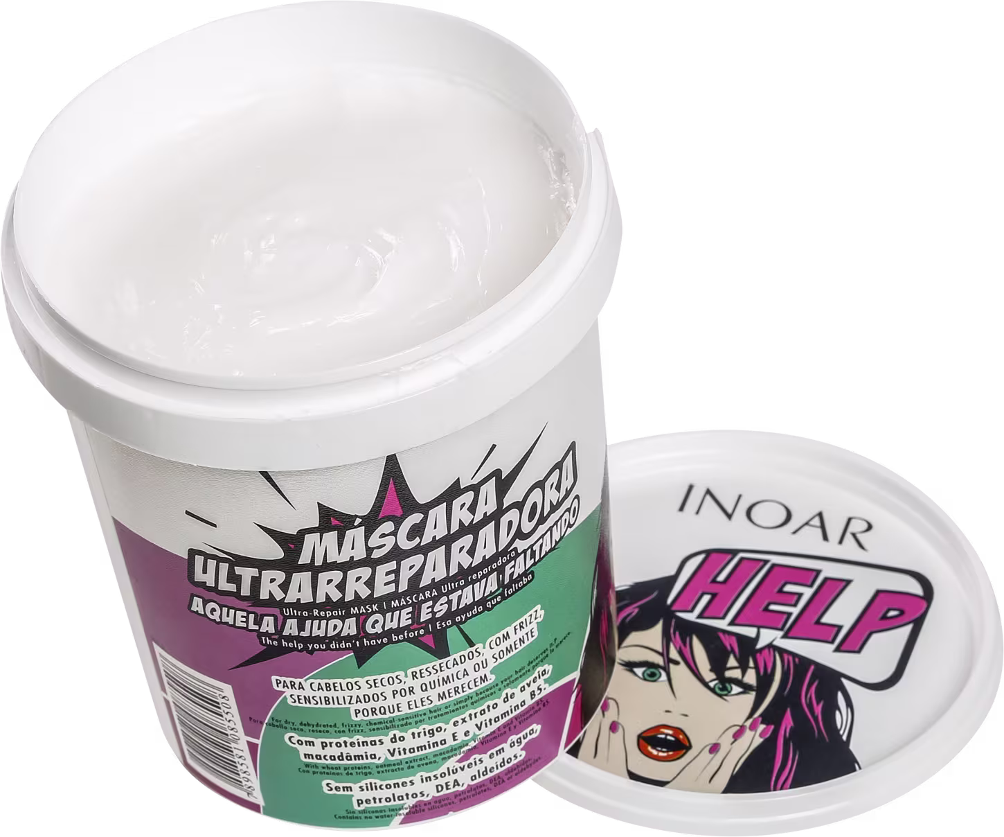 Inoar Help Máscara Ultrarreparadora recupera e reestrutura o cabelo, conferindo força, resistência e brilho intenso. Ajuda a selar a cutícula do fio danificado por produtos químicos e calor, além de eliminar o frizz. Possui fórmula rica em proteínas do trigo, extrato de aveia e macadâmia, além de vitaminas.